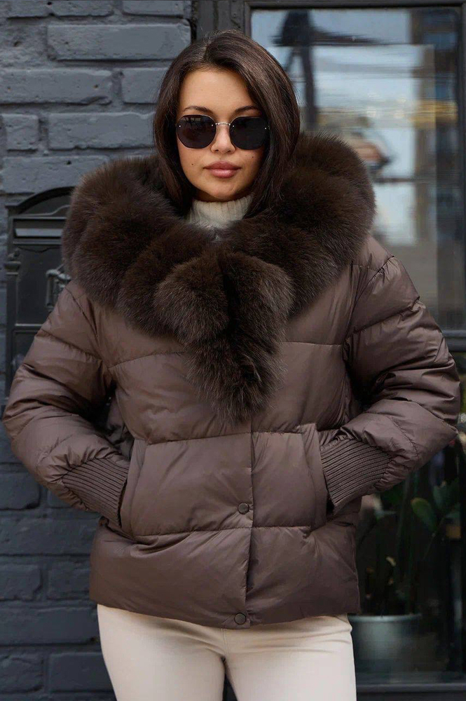 Зимняя пуховая куртка Vivilona коричневого цвета с мехом песца на воротнике и капюшоне. Надежная застежка — молния и кнопки. Удобные трикотажные манжеты обеспечивают тепло и комфорт в холодную погоду. Идеальный выбор для зимних прогулок.
